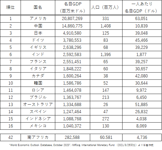表1はIMFによる2020年の国別のアメリカ合衆国ドル建ての名目GDP(予想値)を上位からリスト化したもので、10億米ドル以上の国と南アフリカのGDP(単位は百万米ドル)、人口(単位は百万人)、一人あたりGDP(単位は米ドル)を掲載しています。なお、表1に掲載されていないGDP17位のオランダと16位として掲載されているメキシコの間には、GDP(総額)に開きがあり、10億米ドルという線引きは現実的妥当性があると考えます。